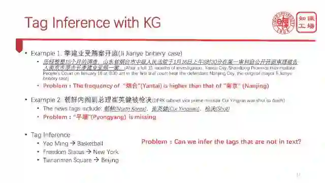 关于标签的不正确性,我们做一个tag inference。这里有两个真实的案例,第一个案例就是季建业受审的案子,我们要给这个新闻打合理的标签,这个标签难在什么地方呢?大家都知道季建业是南京市长,在山东烟台受审,结果“烟台”出现的频率显著高于“南京”,但是这个新闻按道理应该是“南京”打的这个标签权重高于“烟台”,那么怎样识别出更准确的标签呢?怎么把“烟台”这个标签弱化,而把“南京”这个标签给强调出来?