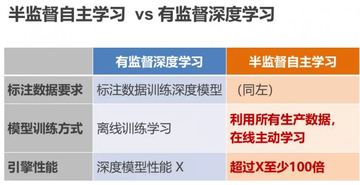 对比有监督深度学习和半监督自主学习,两者对标注数据要求是一样的。从模型的训练方式看,前者是离线训练,后者是利用生产数据在线主动学习。引擎性能方面,如果通过有监督深度学习训练的模型性能为 X,通过半监督自主学习的模型在性能上可超过 X 100 倍。
