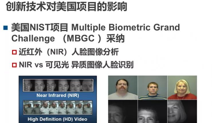 我们的创新对国际也产生了影响,美国国家标准技术研究院发布的数据库和和国防部的应用技术项目,其中近红外人脸识别是我的一个发明,这是世界上第一个能够把人脸识别技术变成产品的技术,国内很多厂家都在采用,特别是深圳的厂家;另外还有异质图像人脸识别。