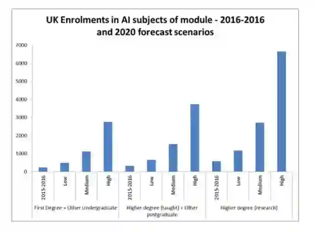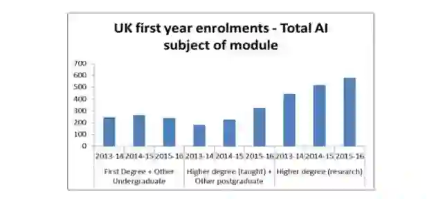 在2015年,物理科学研究委员会(EPSRC)的博士生研究人工智能的人数是436。其中80个完全研究人工智能。其中212个研究内容至少50%是人工智能(另外50%在其他领域,特别是机器人技术),另外224个在人工智能领域的研究比例低于50%,而是通常研究应用领域。