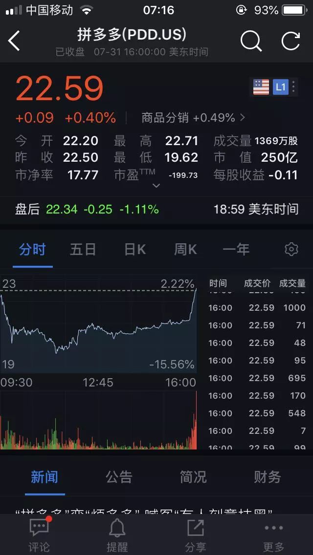 然而中盘后拼多多股价开始回升,最终收报22.59美元,微涨0.40%,市值为250.25亿美元。