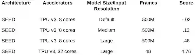 结果显示,随着输入分辨率越高以及模型越大, SEED RL的得分就越高,而随着训练得越多,模型的性能也得到了显著提高。