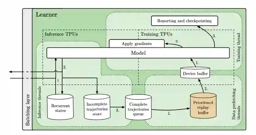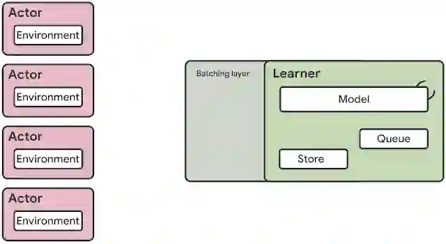 其中,神经网络推理集中由 Learner在专用的硬件(GPU或 TPU)上进行,通过确保模型参数和状态不出本地,从而来加速推理,并避免数据传输的瓶颈。
