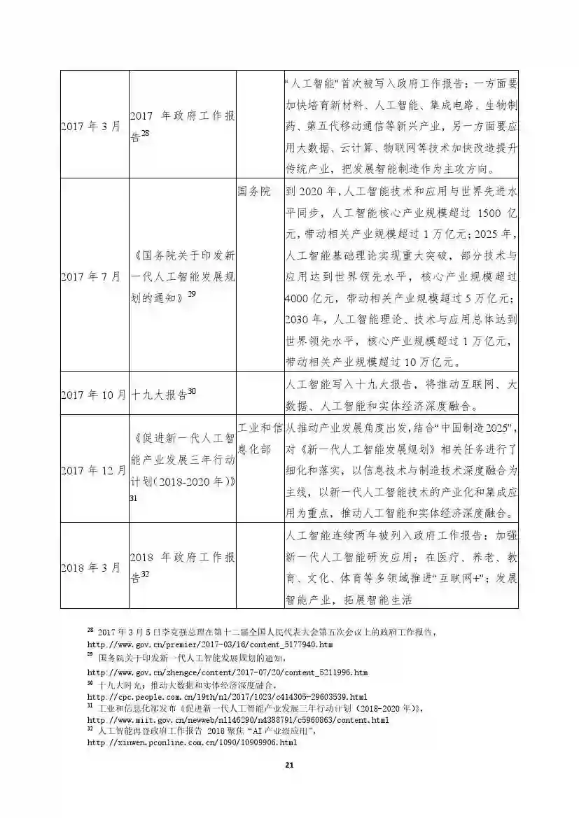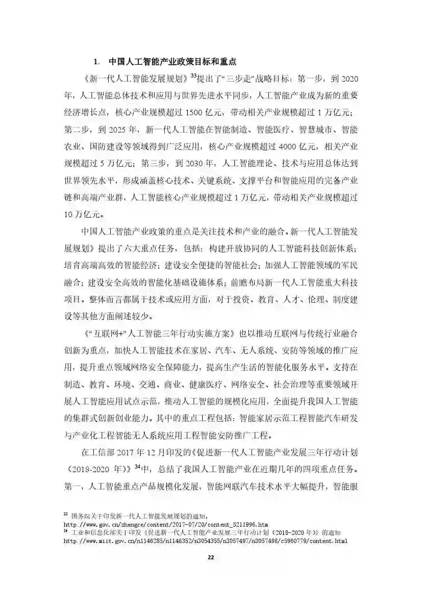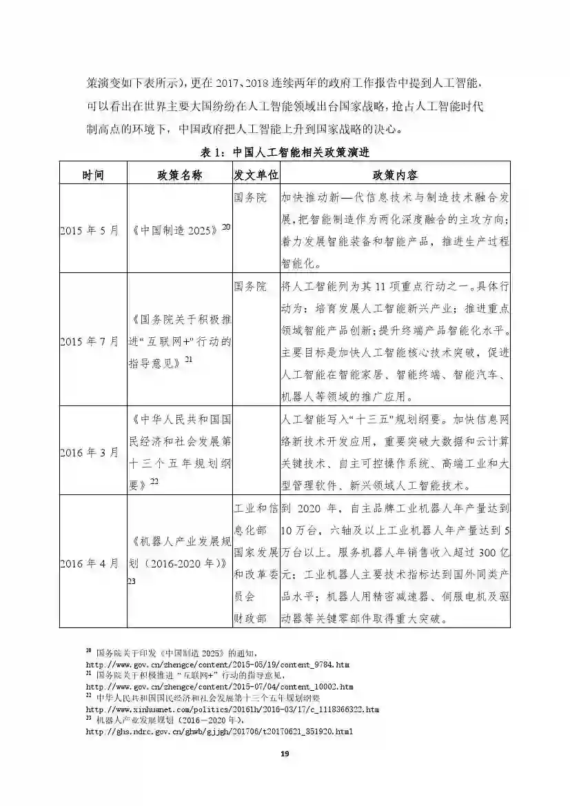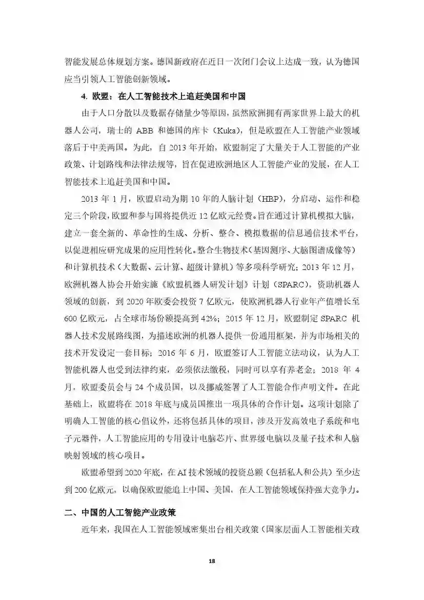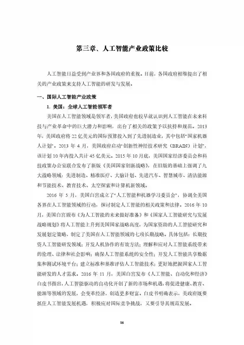 报告的第三章对比了中外人工智能产业政策。课题组着重列举了美国、英国、德国和欧盟作为国际范围的对比研究对象,指出这些国家和地区都将人工智能技术的发展列为战略发展目标,并投入了巨大的财力以支持人工智能技术的发展。与此同时,我国在近些年密集出台支持人工智能发展的政策,例如给予人工智能相关企业税收优惠,财政支持等举措,更在2017、2018连续两年的政府工作报告中提到人工智能,可见中国政府要把人工智能上升到国家战略的决心。