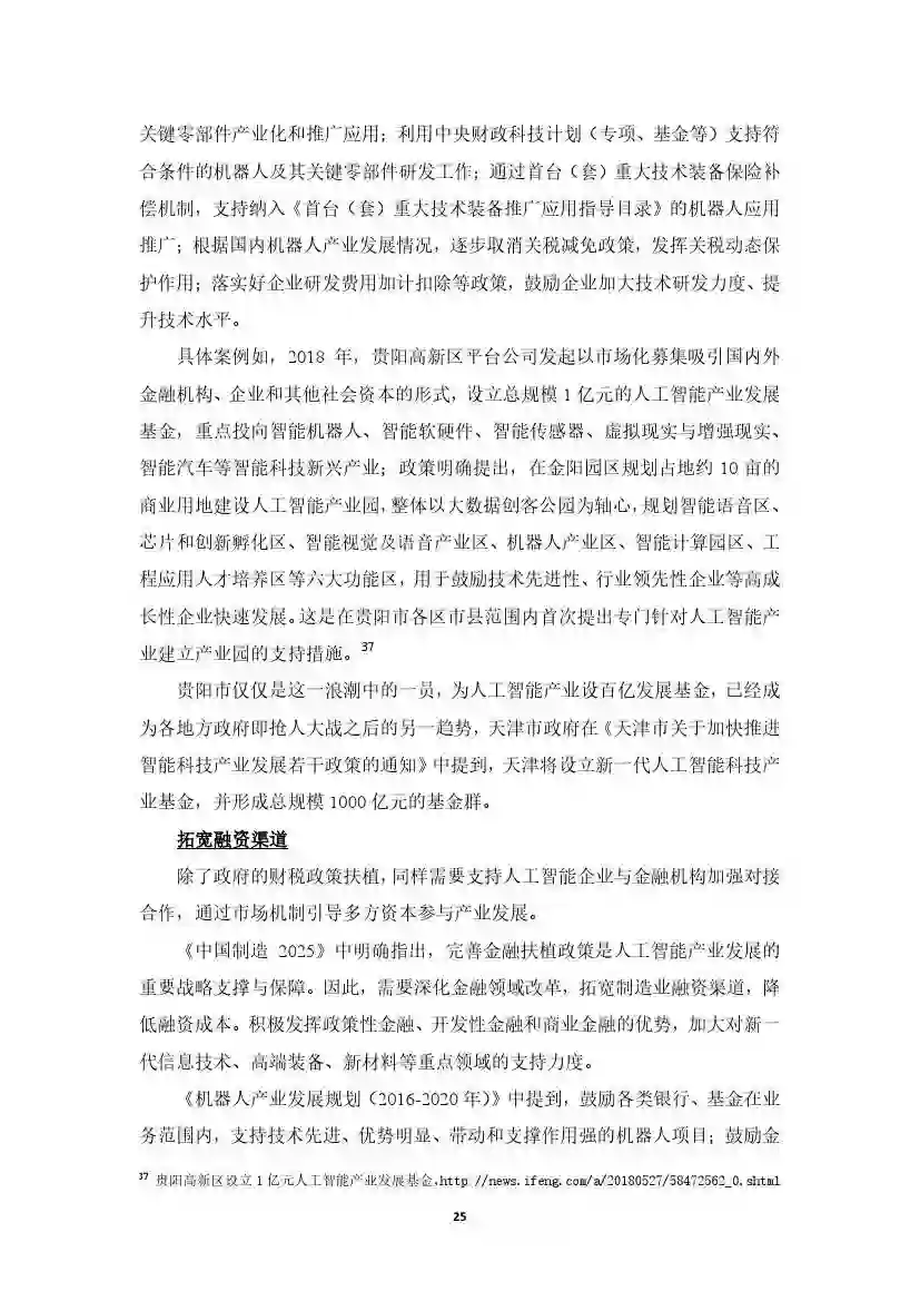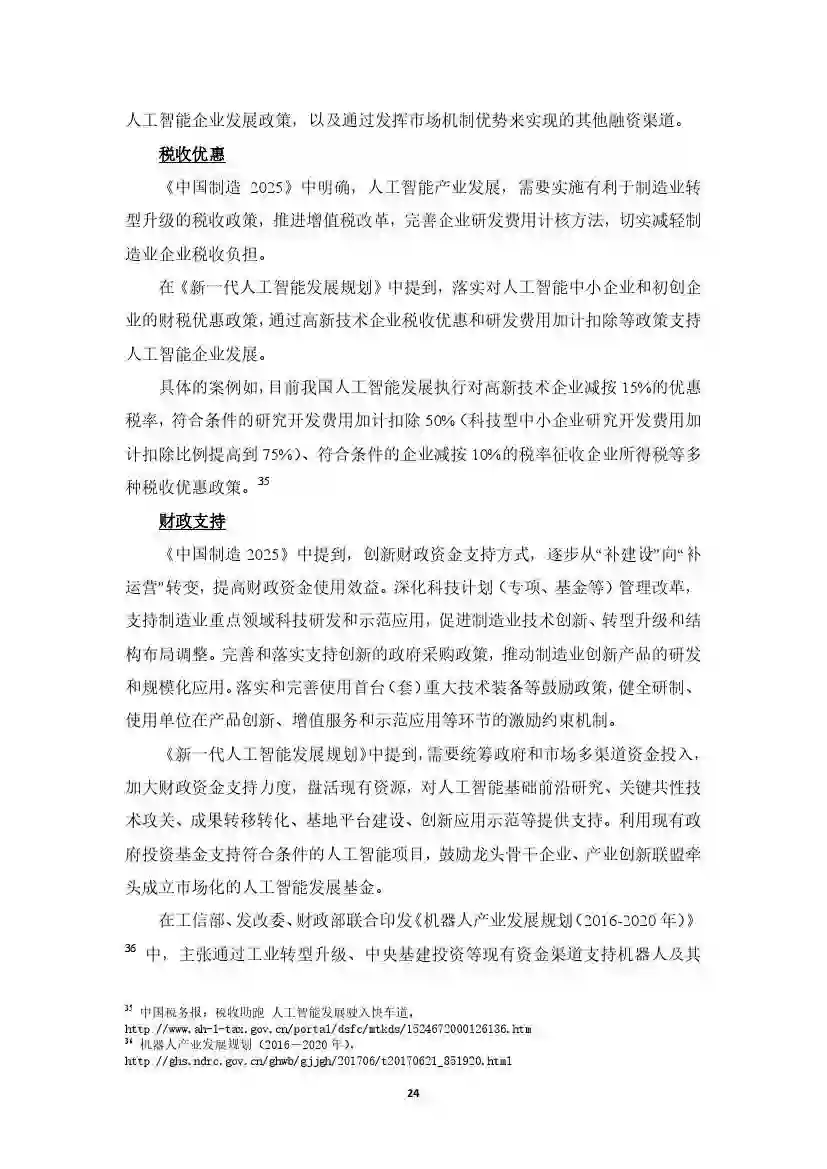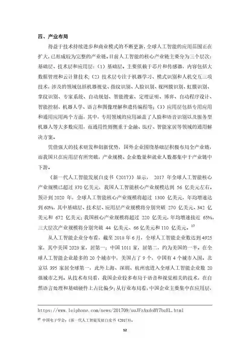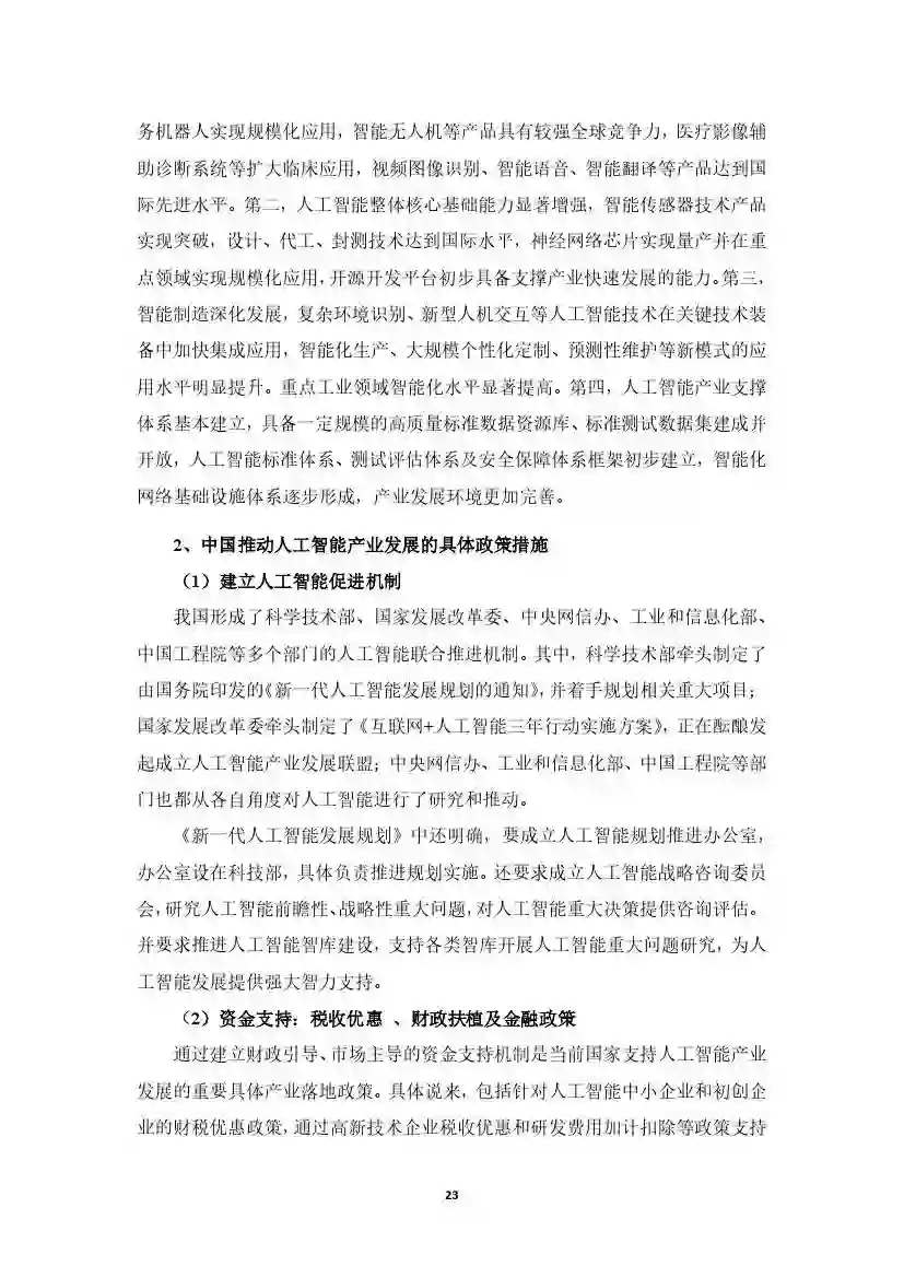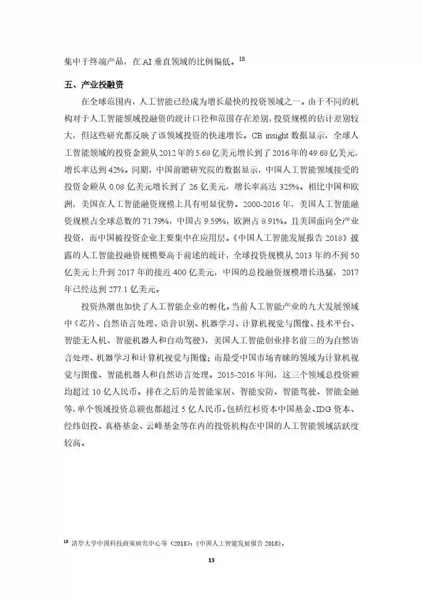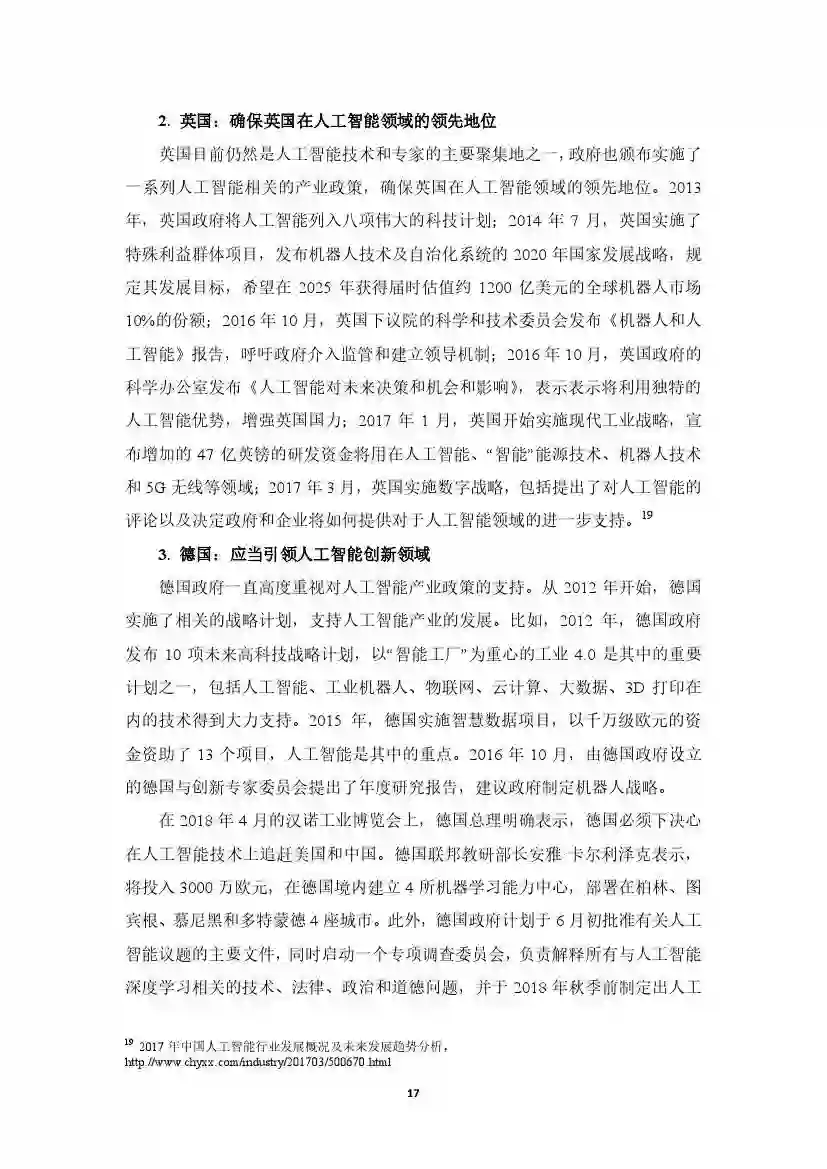 报告的第三章对比了中外人工智能产业政策。课题组着重列举了美国、英国、德国和欧盟作为国际范围的对比研究对象,指出这些国家和地区都将人工智能技术的发展列为战略发展目标,并投入了巨大的财力以支持人工智能技术的发展。与此同时,我国在近些年密集出台支持人工智能发展的政策,例如给予人工智能相关企业税收优惠,财政支持等举措,更在2017、2018连续两年的政府工作报告中提到人工智能,可见中国政府要把人工智能上升到国家战略的决心。