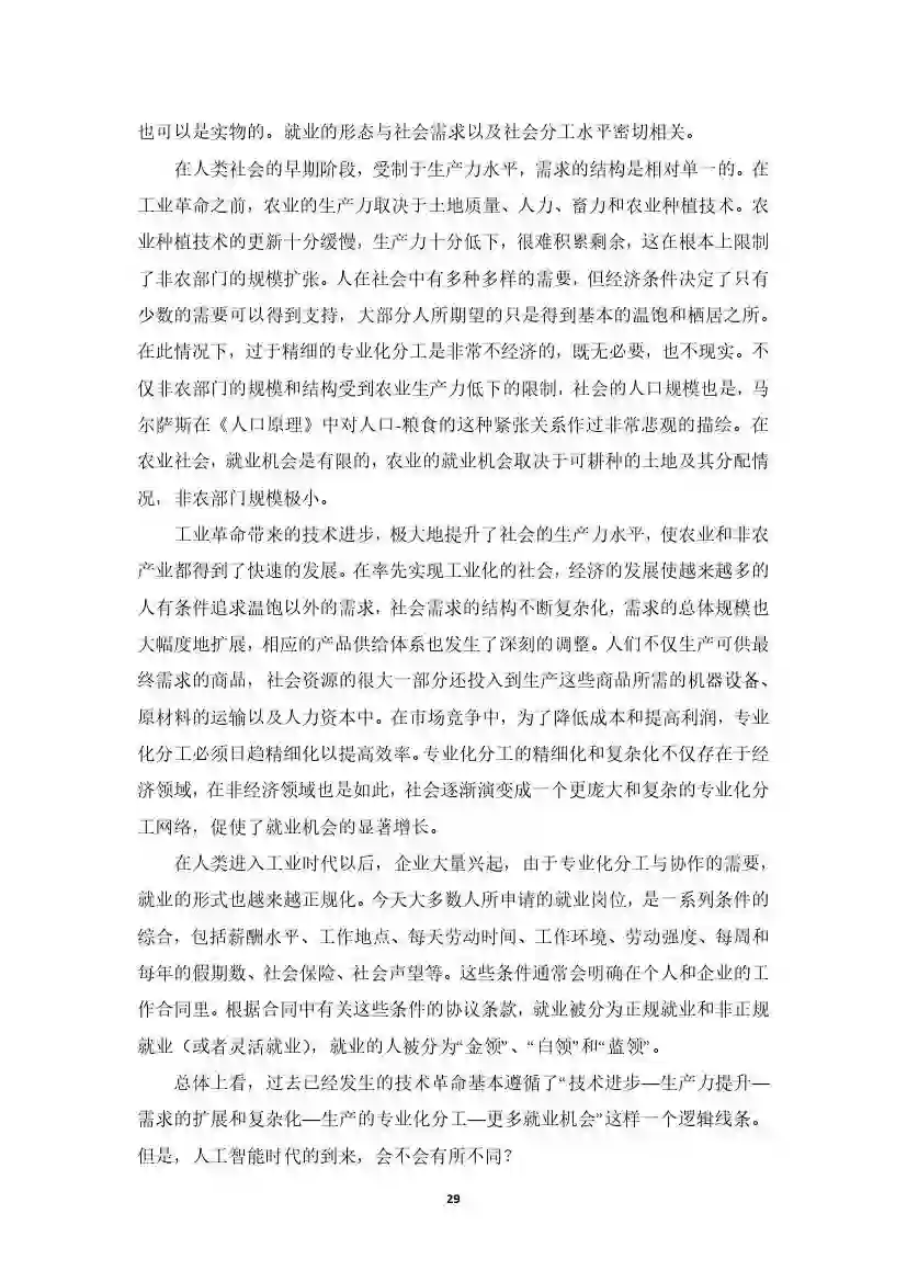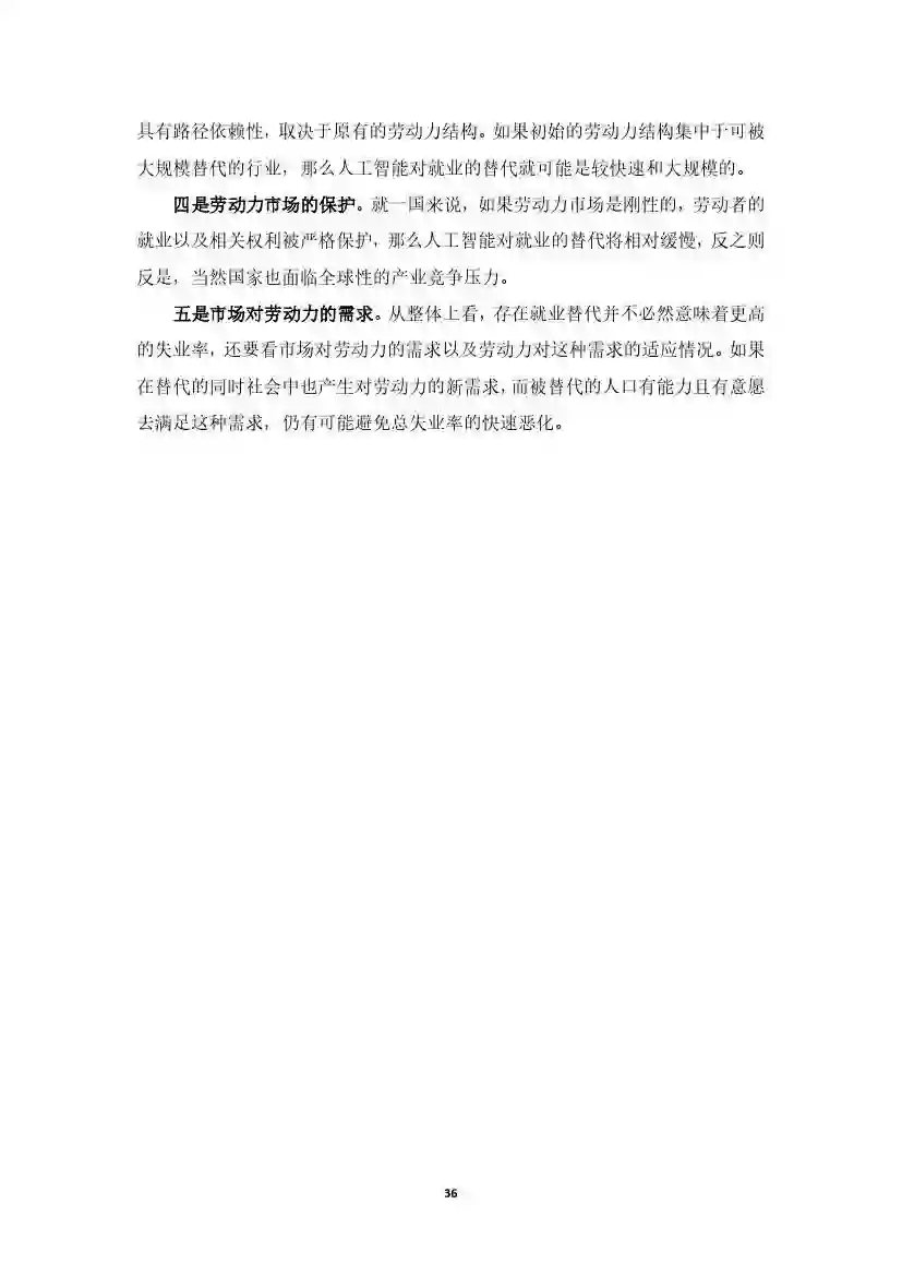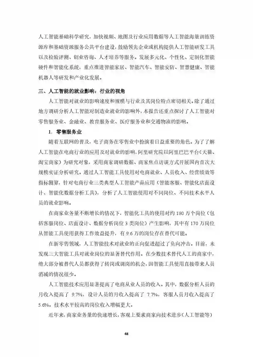 报告的第四章从理论上分析人工智能对就业可能会产生的影响。课题组以史为鉴,以从蒸汽革命开始的专业化分工现象为基础,并结合一般经济学原理和现实情况,从理论上分析了人工智能技术的发展对就业产生的潜在影响。具体说来,人工智能对就业的影响随行业的差异有所不同,在人工智能取代重复性强、程式化程度高的工作的同时,也会对工作岗位产生扩大需求和创造岗位的积极影响。