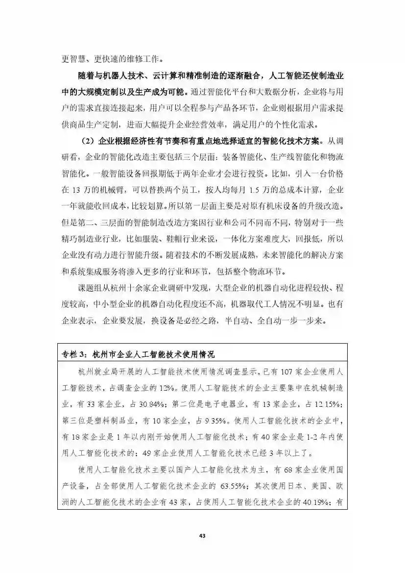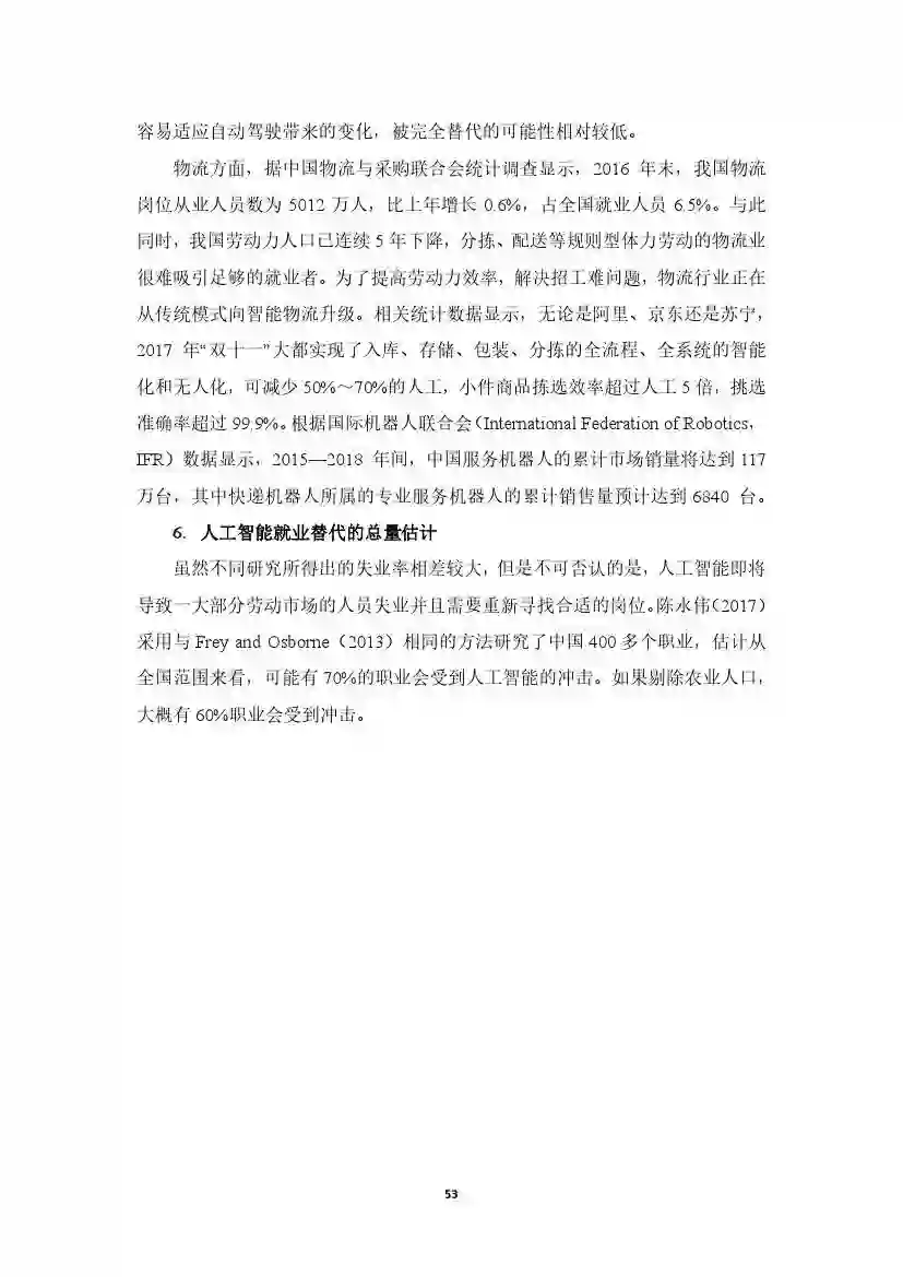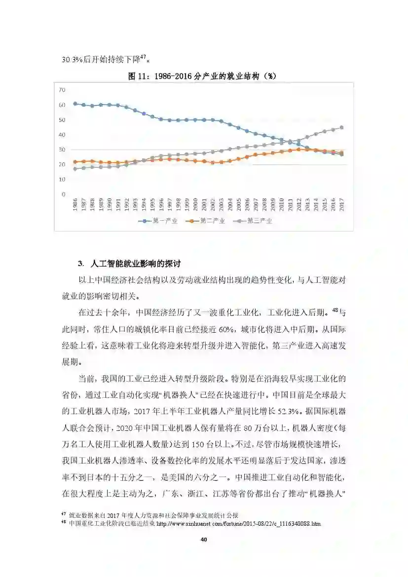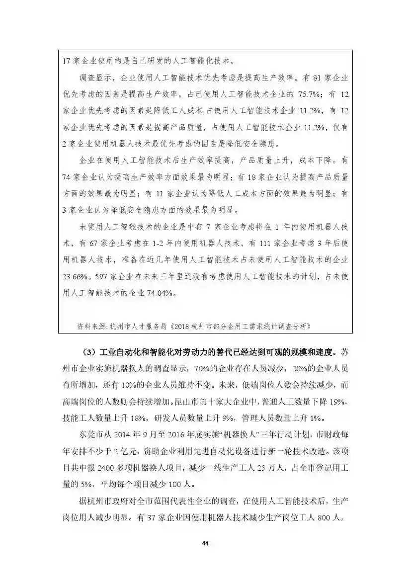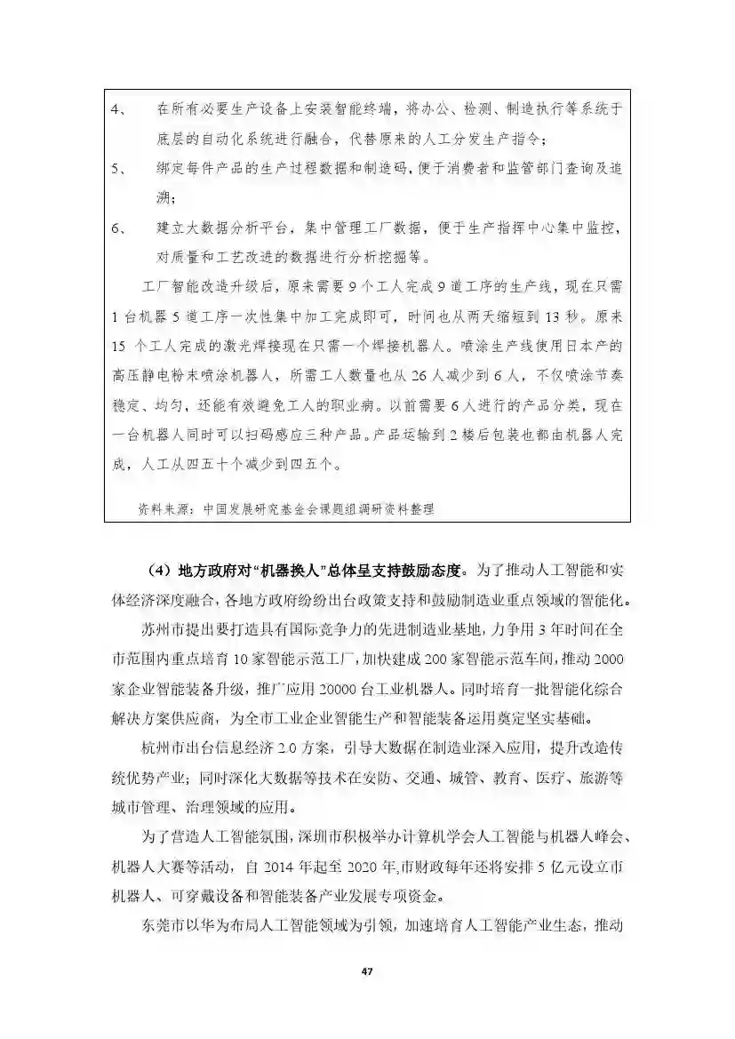 课题组也通过走访广东、江浙等传统制造大省研究“机器换人”的情况,调研得出结论:人工智能的相关技术已经深入到制造业的各个环节;从生产、流通到销售都越来越趋于数据化、智能化,并且工业自动化和智能化对劳动力的替代已经达到可观的规模和速度。