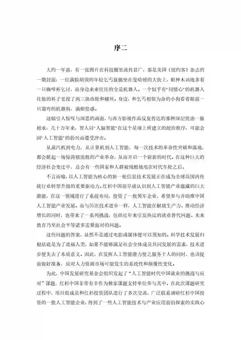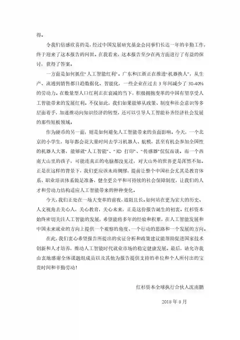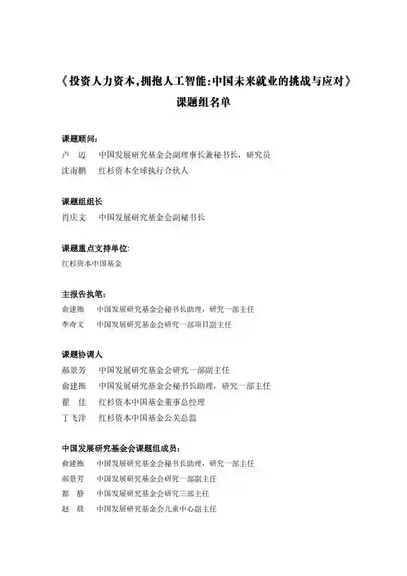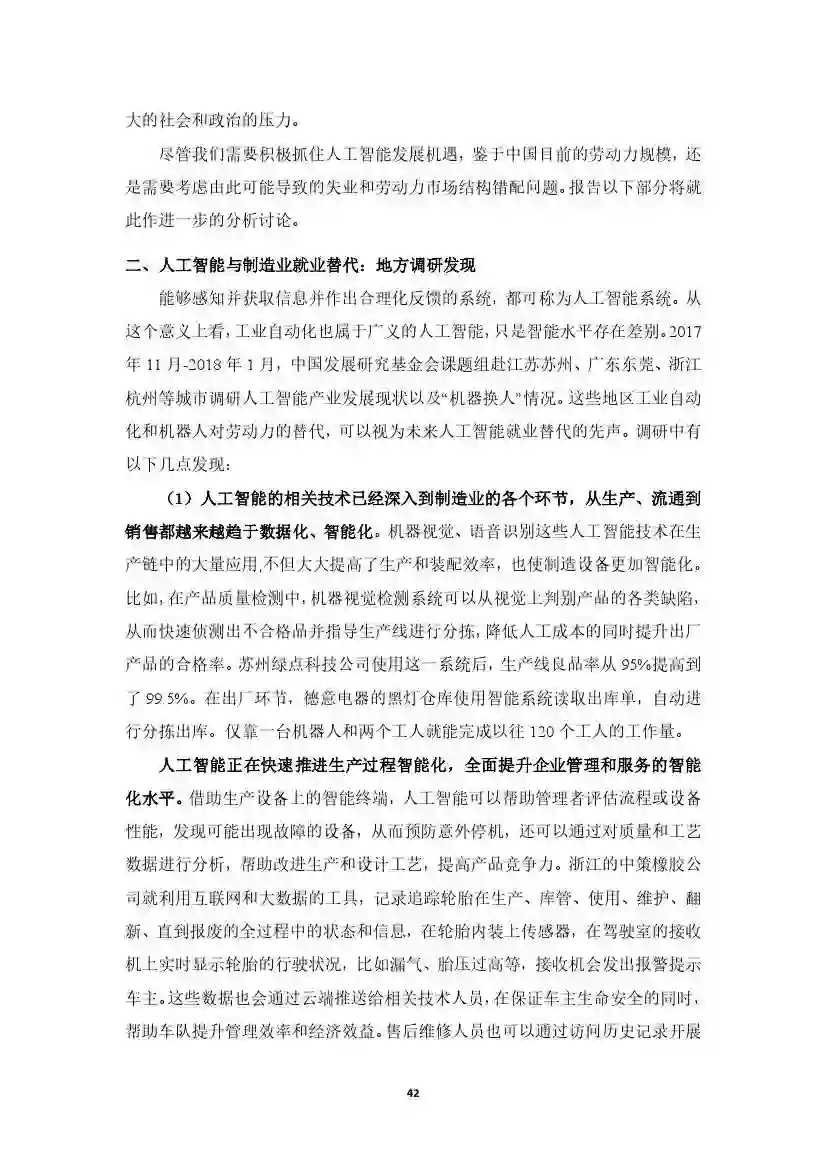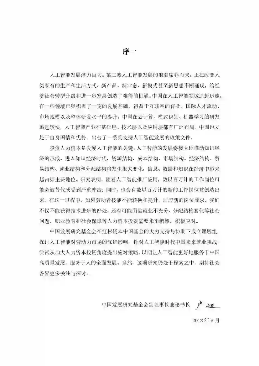 近日,中国发展研究基金会联合红杉资本中国基金,对外发布了一份名为《投资人力资本,拥抱人工智能:中国未来就业的挑战与应对》的研究报告。在这篇报告中,研究课题组对比中外、调研一线企业、并且走访了广东、江浙等制造大省,理论与实践相结合,具体分析了人工智能对于中国就业可能产生的影响并提出了发展建议。