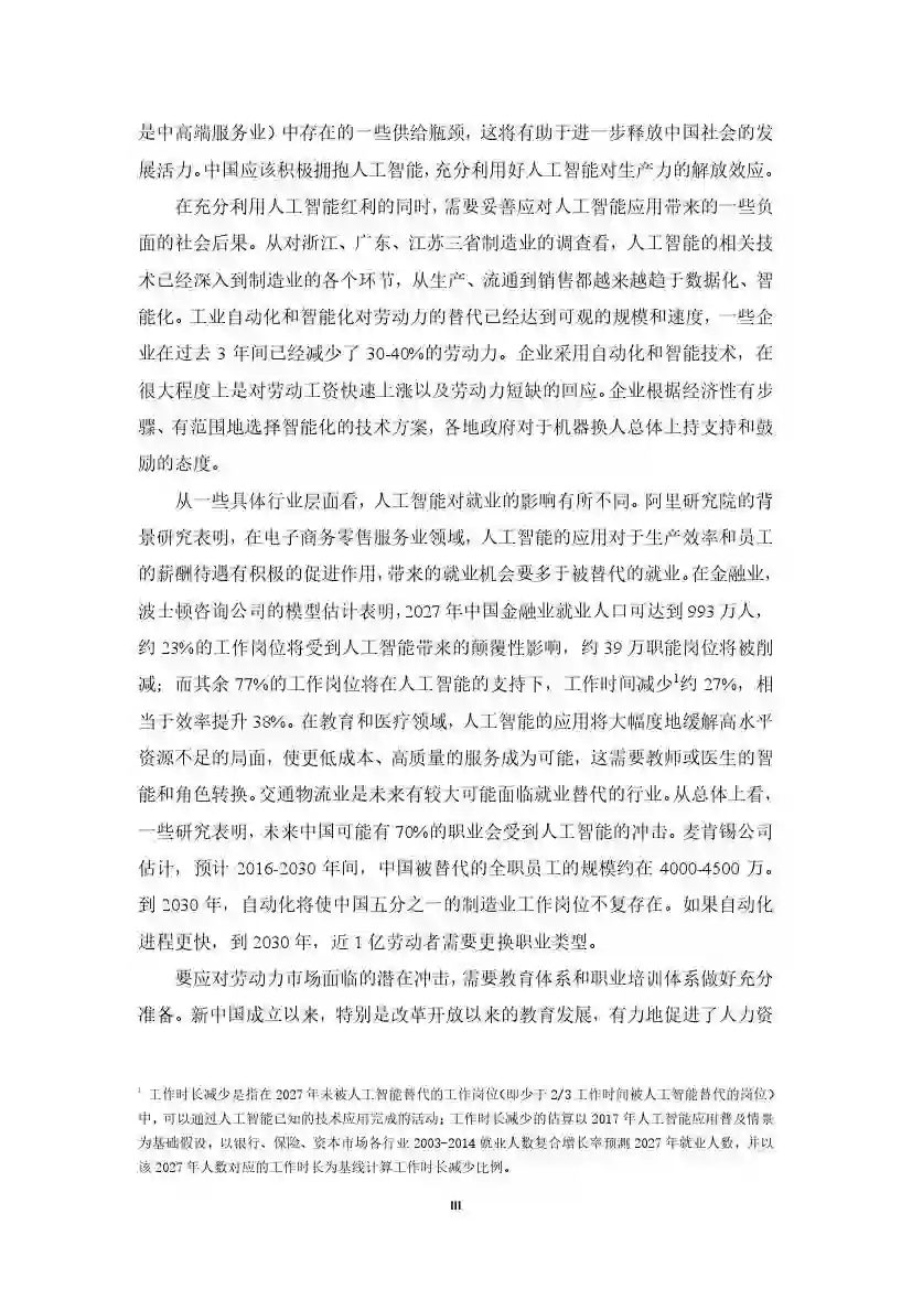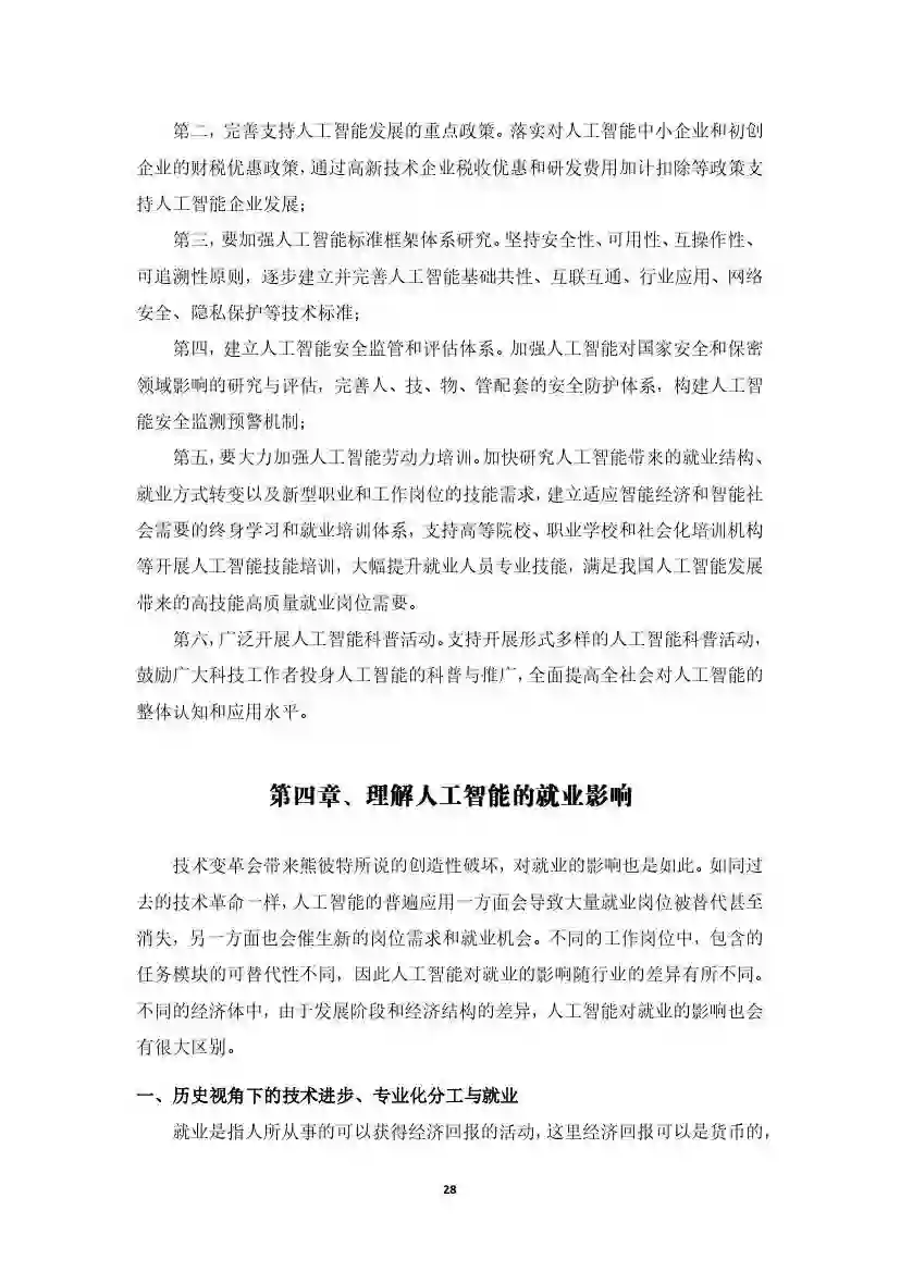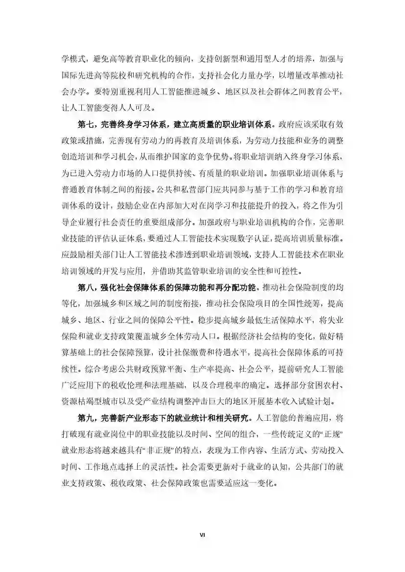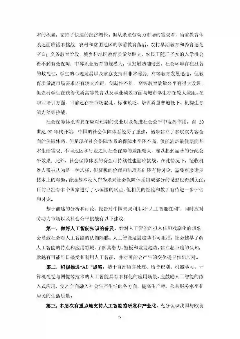报告的后两章指出了中国发展人工智能技术在教育和社会保障方面的可能会遇到的挑战以及人工智能在我国发展应对建议。