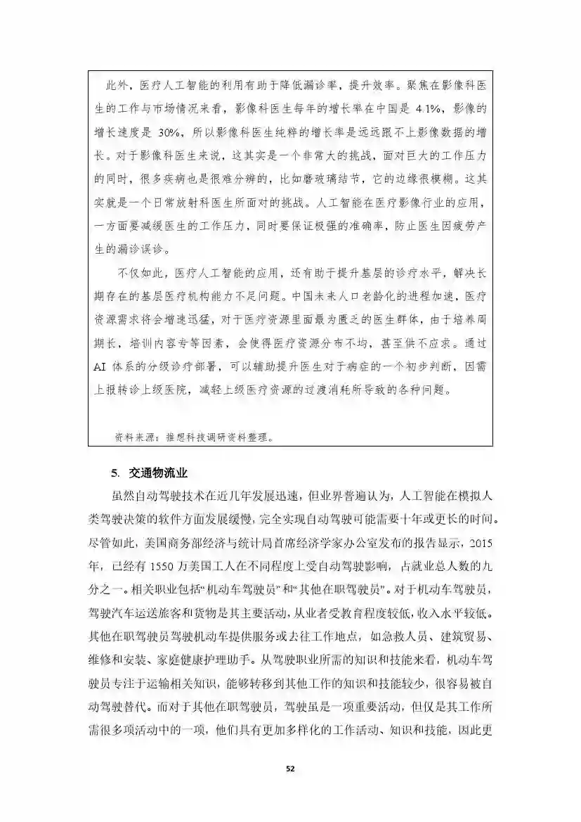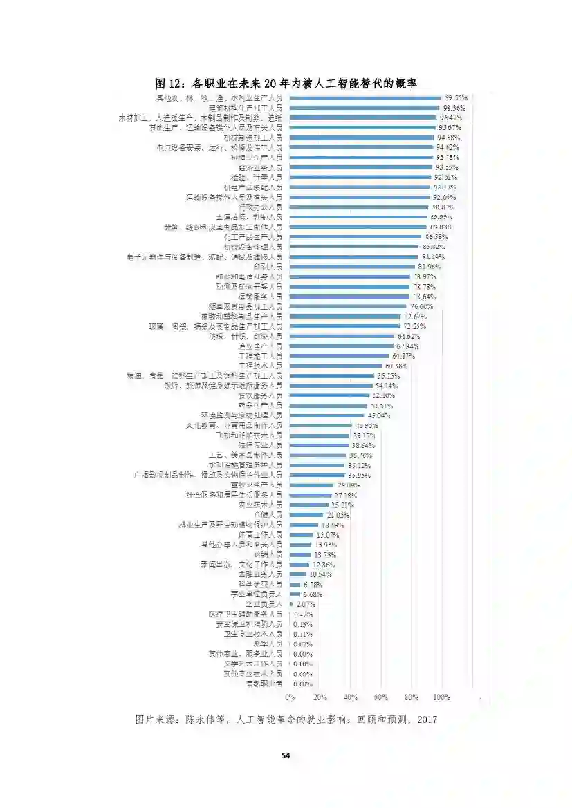 在本章节的最后,报告引用了陈永伟的报告,列出了各职业在未来20年内被人工智能代替的概率。