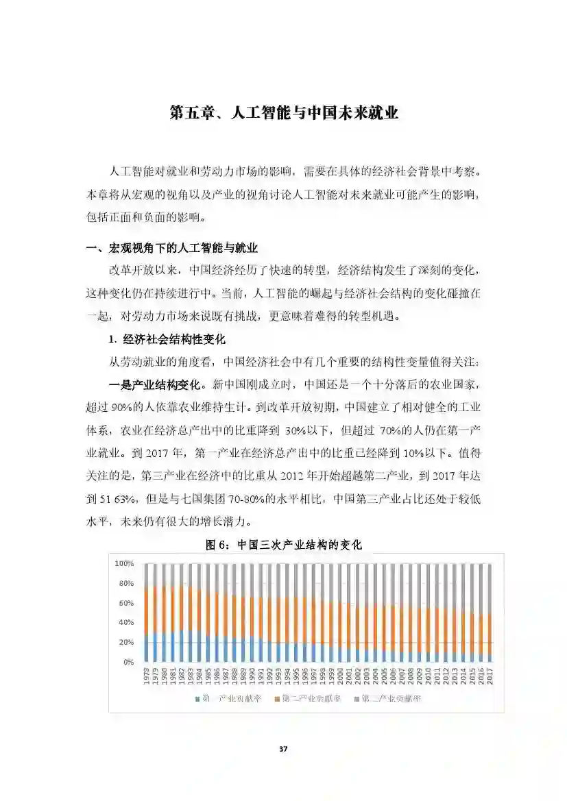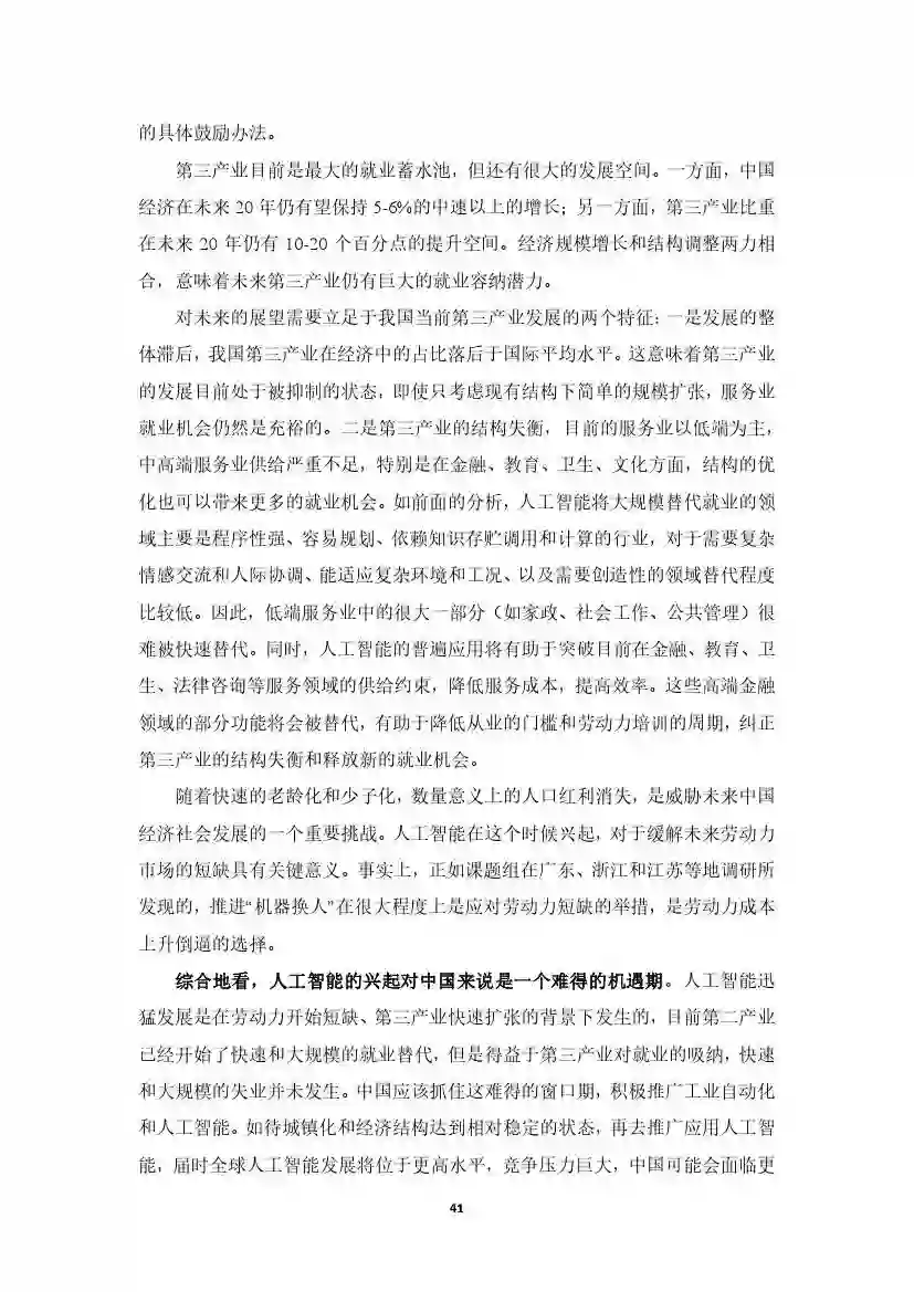 在宏观视角下,人工智能的发展会对经济社会结构(产业结构、城镇化、老龄化和少子化)以及劳动就业结构产生影响,综合来看,人工智能的兴起对中国来说是一个难得的机遇期,即使会遇到一些挑战,我们也应该一如当年“入世”的模样,积极拥抱而非“谈虎色变”。