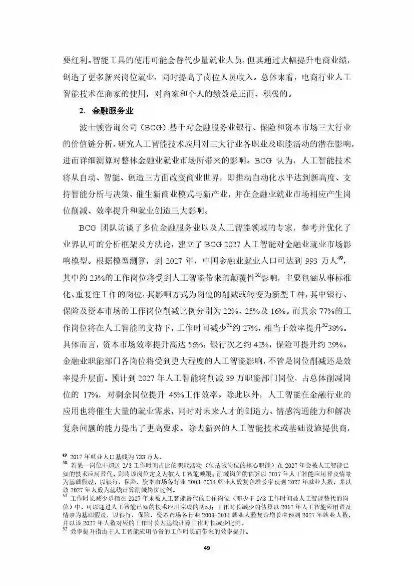 在分行业的视角下,课题组以零售服务业、金融服务业、教育服务业、医疗服务业、交通物流业五个行业作为重点研究行业,通过数据分析、案例分析等方法讨论了人工智能对这些行业的影响。报告指出,通过人工智能的技术,可以降低这些行业的单位营运成本,提高企业的运营效率。