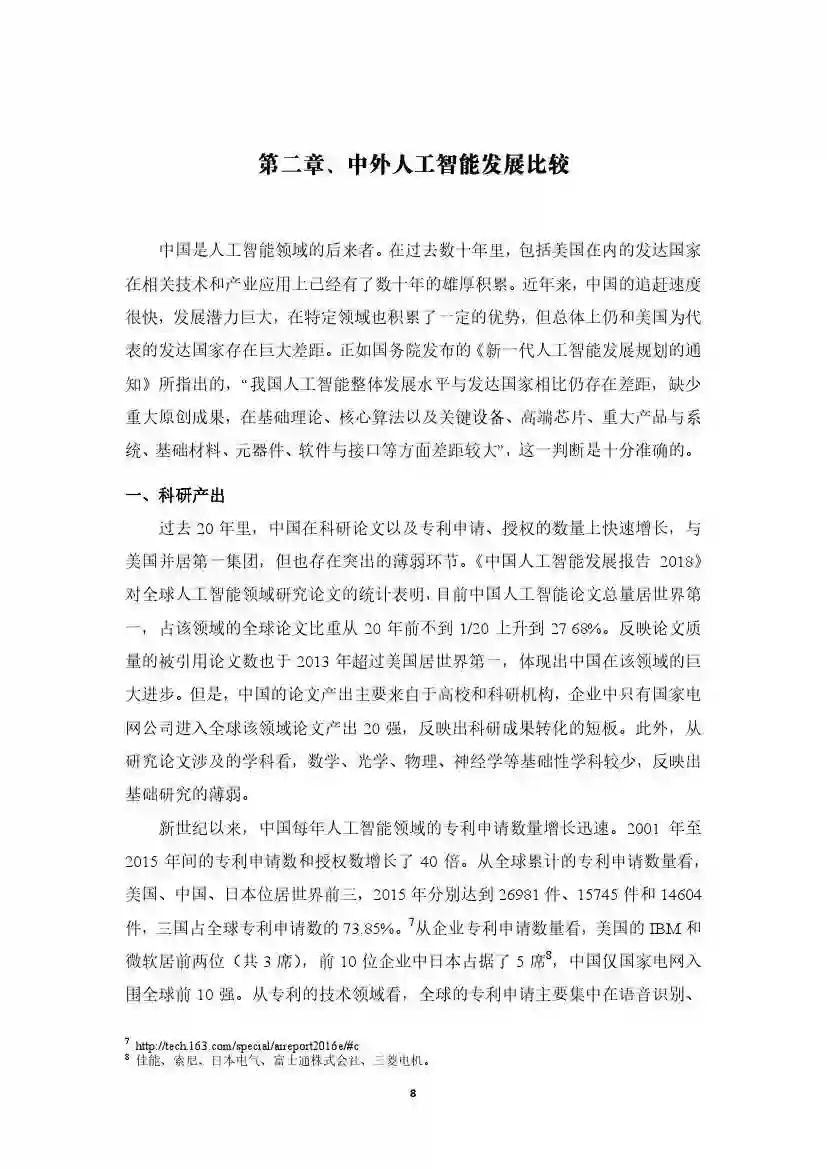 《投资人力资本,拥抱人工智能:中国未来就业的挑战与应对》的第二章对比了中外人工智能的发展水平与特点。课题组分别从科研产出,人才储备,核心技术、关键硬件和元器件,产业布局,产业投融资五个部分,纵向和横向对比了中国与国际人工智能发展的水平以及特点。一言以蔽之,虽然我国近些年人工智能技术发展迅速,但和以美国为代表的发达国家相比,仍存在差距。