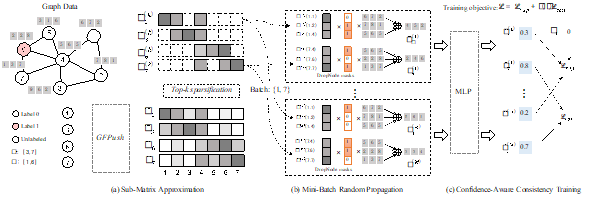 为了解决上述缺陷,我们对 GRAND 模型进行了改进,提出了一种高效可扩展的图半监督学习框架 GRAND+。相比于 GRAND,GRAND+主要对三个方面进行了改进:1.灵活性:GRAND+使用一个通用的混合多阶random walk概率转移矩阵进行特征随机传播,该矩阵通过一组可调整的权重来控制不同阶邻居的重要性,使得模型可以灵活地处理现实中多样的图数据。2.可扩展性:为了提升模型的可扩展性,GRAND+使用了一个通用的矩阵近似算法 GFPush(Generalized Forward Push)和 Top-k 稀疏化技术来对传播矩阵进行近似计算,这种矩阵近似范式可以支持模型以批量化的方式进行随机传播和模型训练,使得 GRAND+的训练过程的时间消耗与图大小无关,可以高效地处理大图。3.预测性能:GRAND+使用了一种新的置信度感知一致性损失(Confidence-aware consistency loss)来进行一致性正则化训练,该损失在计算时会把预测置信度低的无标注节点过滤掉,减少了训练中的噪声,从而进一步提升了模型效果。GRAND+的模型示意图如下所示: