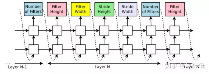 被人们所熟知的第一篇NAS工作应该是Google的这篇NEURAL ARCHITECTURE SEARCH WITH REINFORCEMENT LEARNING[ICLR'17,https//arxiv.org/pdf/1611.01578.pdf],充分展现了Google的实力和财力(划掉)。思路也是简单明了,以前每一层的filter数量大小等等都需要人为来定,那就可以做成一个优化问题列几个选项让它自己选个最好的,这样的选择组合起来就成了编码某个网络结构的token。为了让其更加灵活支持变长token,使用RNN来作为这里的controller,然后用policy gradient来最大化controller采样网络的期望reward,也就是validation accuracy