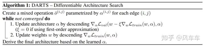 权重的优化和DAG里面weight的优化类似于ENAS,也是交替进行的(在训练集上优化weight,在验证集优化权重),不过DARTS是整个DAG进行forward-backward(这样的缺点在于内存开销会比较大)而不是像ENAS一样先采样子图。