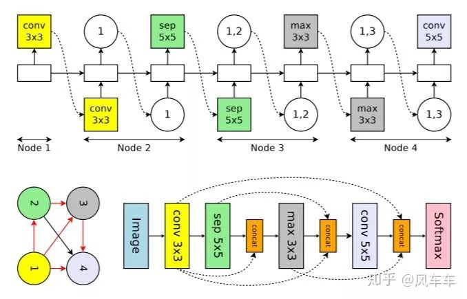 还有一个很快就能跑完的NAS工作是用可微分的方式进行搜索的DARTS: Differentiable Architecture Search[ICLR'19,https//arxiv.org/abs/1806.09055],在今年被各种魔改(我猜很可能是因为开源了pytorch的代码,然后代码写得很漂亮改起来也比较容易)。DARTS和ENAS很像,也是从DAG中找子图,并且同样采用了weight sharing,主要的区别在于搜索空间和搜索算法上。搜索空间比较类似NASNet search space,搜索算法则是采用了可微分的方式。