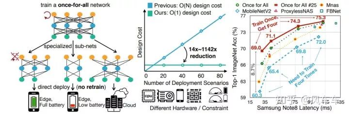 最后再介绍一个同样是Song Han组最近的工作,Once for All: Train One Network and Specialize it for Efficient Deployment[https//arxiv.org/abs/1908.09791],直接train一个大网络,需要哪种网络直接去里面取就可以,将训练过程和搜索的过程解耦开来,相当于只需要train一次。