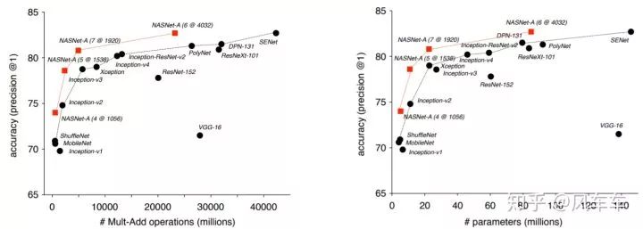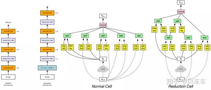 于是Google又出了一篇Learning Transferable Architectures for Scalable Image Recognition[CVPR'18,https//arxiv.org/pdf/1707.07012.pdf]。那我不搜整个结构,搜个cell然后堆起来就行了,反正VGG/Inception/ResNet也是这么干的,于是沿用了之前的思路,继续用RNN和policy gradient在新的搜索空间中寻找最佳的结构,在cifar上搜cell然后堆起来用到ImageNet上。搜索目标只包括两种cell,一种是normal cell,另一种reduction cell用于downsample,每个cell里面包括一些block,新的搜索空间包括选择这些block使用什么op,用什么作为输入等。之后很多工作都沿用了NASNet Search Space这个套路。