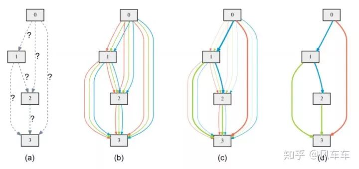 DARTS里面的一个cell,不同颜色的边表示不同的操作,颜色深浅表示不同的权重,最后留下权重最大的