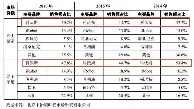 近三年来,无论是线上还是线下,科沃斯销量都遥遥领先iRobot、海尔、浦桑尼克、福玛特、美的等。