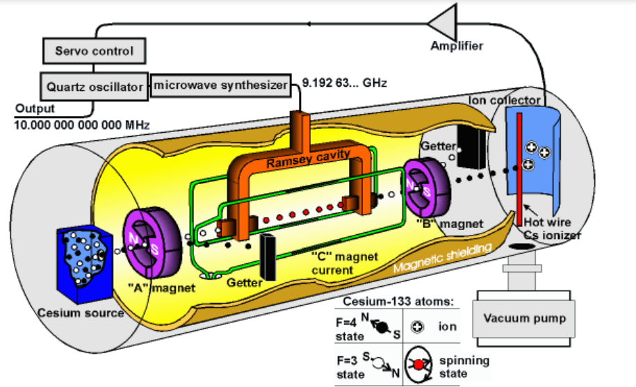 而其中最为精确的原子钟的历史,可以回溯到一百年前的上世纪30年代,美国哥伦比亚大学实验室的拉比,在研究原子及其原子核的基本性质时获得了一定突破,在拉比设想的时钟里,处于某一特定的超精细态的一束原子穿过一个振动电磁场,场的振动频率与原子超精细跃迁频率越接近,原子从电磁场吸收的能量就会越多,并因此而经历从原先的超精细态到另一态的跃迁。反馈回路可调节振动场的频率,直到所有原子均能跃迁。原子钟就是利用振动场的频率作为节拍器来产生时间脉冲,为此拉比获得了1944年的诺贝尔奖,后来拉比的学生拉姆齐还因大幅提高了原子钟的精度,也斩获了1989年的诺贝尔奖。不过原子钟又是一个横跨量子物理、电子电路、物理光学、几何光学等多个领域的结合体,比如这个NIST F-1原子钟,它由170个元器件组成,其中包括透镜,反射镜和激光器。位于中部的管子高1.70米,铯原子在其中上下移动,发出极为规则的时间“信号”。