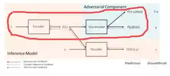 为控制属性y,增加了一个判别器(Discriminator)使得Encoder输出的E(x)不包含熟悉y的信息,即Encoder和Discriminator首先组成了一个GAN生成器判别器组合,下图红色粗线标出的网络: