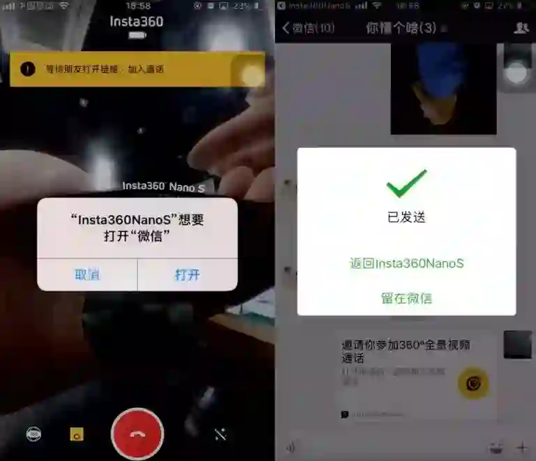 Insta360 Nano S 另一项重点新功能则是一对一“360 视讯通话”,透过生成“通话网址”发送到各类通讯 App(视频中为微信),对方进入后即可看到用户专属的实况转播。 该功能同样支持上文中的画中画模式,比较适合一些家人聚会、商务远距离会议的场景。当然,开脑洞的女同学们也可以作为随时查房的利器,让你的“他”即使是在千里之外也无处遁形。需要注意的是,苹果用户通过导入 Safari 打开没有问题,但安卓手机在使用第三方 浏览器时会 出现打开失败的情况,官方在适配时候还需要细心校对。