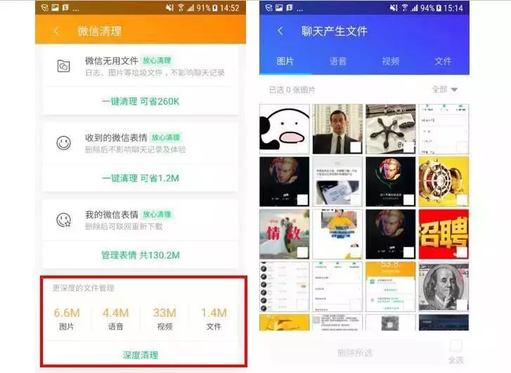针对社交软件中保存的大量无用文件,腾讯管家推出了【微信清理】功能,图片、日志、表情包等无用缓存都可以一键分类清理,且清理后不会影响聊天记录。