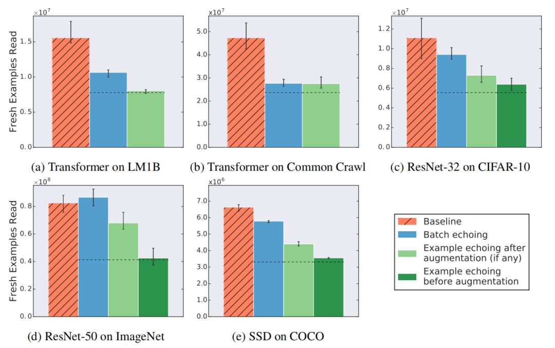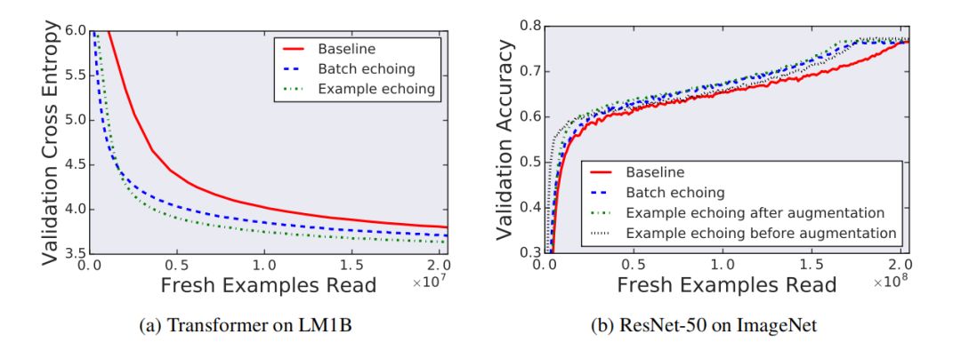 尽管人们可能担心重复使用数据可能会损害最终的表现性能,但实验中没有观察到任何类似情况。为了进一步证明数据回送不会降低解决方案的质量,作者在 LM1B 上使用 Transformer 进行了实验,在 ImageNet 上使用 Resnet-50 进行了实验,在固定新样本数量下找到最佳可实现性能。图 8 显示了在每个实验的训练过程中,数据回送在任何一点上都达到了最佳的性能。所有的数据回送变体都至少实现了与两个任务的基线相同的性能。