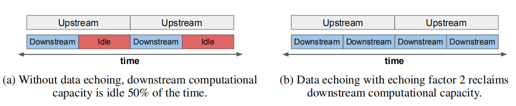 在这篇论文中,作者研究如何通过减少训练前期部分的时间来加速神经网络训练(图 2a)。作者将训练过程中第一部分的输出重复用于多个 SGD 更新,以利用空闲计算能力。这类算法称为 “数据回送”(data echoing),每个中间输出被使用的次数称为 回送因子(echoing factor)。