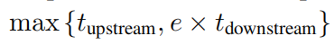 其中 tupstream 是回送上游所有阶段所用的时间,tdownstream 是回送下游所有阶段所用的时间,e 是回送因子。假设 tupstream≥tdownstream,这是使用数据回送的主要动机。如果用 R=tupstream/tdownstream 表示上下游处理时间之比,那么完成一个上游步骤和 e 个下游步骤的时间对于从 e 到 R 的所有回送因子都是相同的。换句话说,额外的下游步骤是“无消耗的”,因为它们使用的是空闲的下游计算能力。