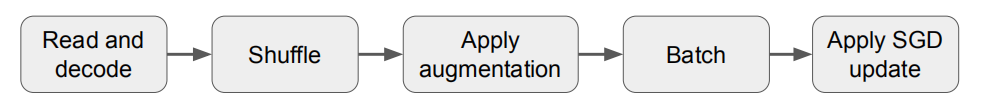 神经网络的训练过程可以看作是一个数据流程,需要对计算进行缓冲和重叠。例如,图 1 显示了小批次随机梯度下降(SGD)及其变体的典型训练流程,这是训练神经网络的标准算法。训练程序首先读取和解码输入数据,然后对数据进行 shuffle,应用一组转换操作来增加数据,并将数据分成不同批次。最后,通过迭代更新网络参数降低损失函数值;此阶段称为“SGD 更新”。由于任何流程阶段的输出都可以缓冲,因此不同阶段的计算互相重叠,最慢的阶段将占用主要的训练时间。