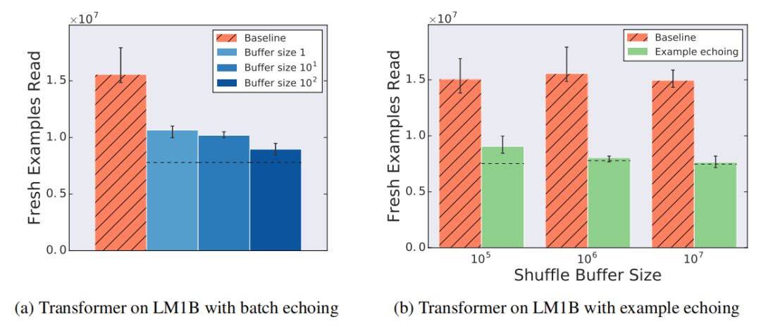 数据回送的表现也受回送阶段后 shuffle 程度的影响。在适用的情况下,作者将 shuffle 作为缓冲区。缓冲区越大,shuffle 程度越高,训练算法能够近似于将整个训练集加载到内存中。