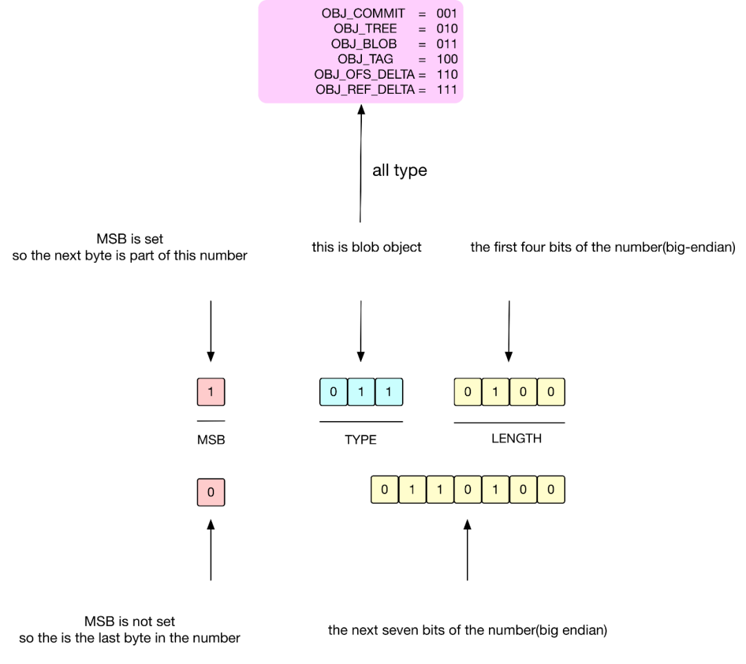 如果对象类型是 OBJ_OFS_DELTA 类型, 表示的是 Delta 存储,当前 git 对象只是存储了增量部分,对于基本的部分将由接下来的可变长度的字节数用于表示 base object 的距离当前对象的偏移量,接下来的可变字节也是用 1-bit MSB 表示下一个字节是否是可变长度的组成部分。对偏移量取负数,就可知 base 对象在当前对象的前面多少字节。