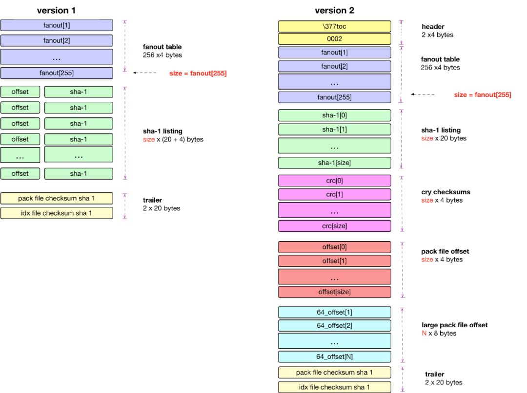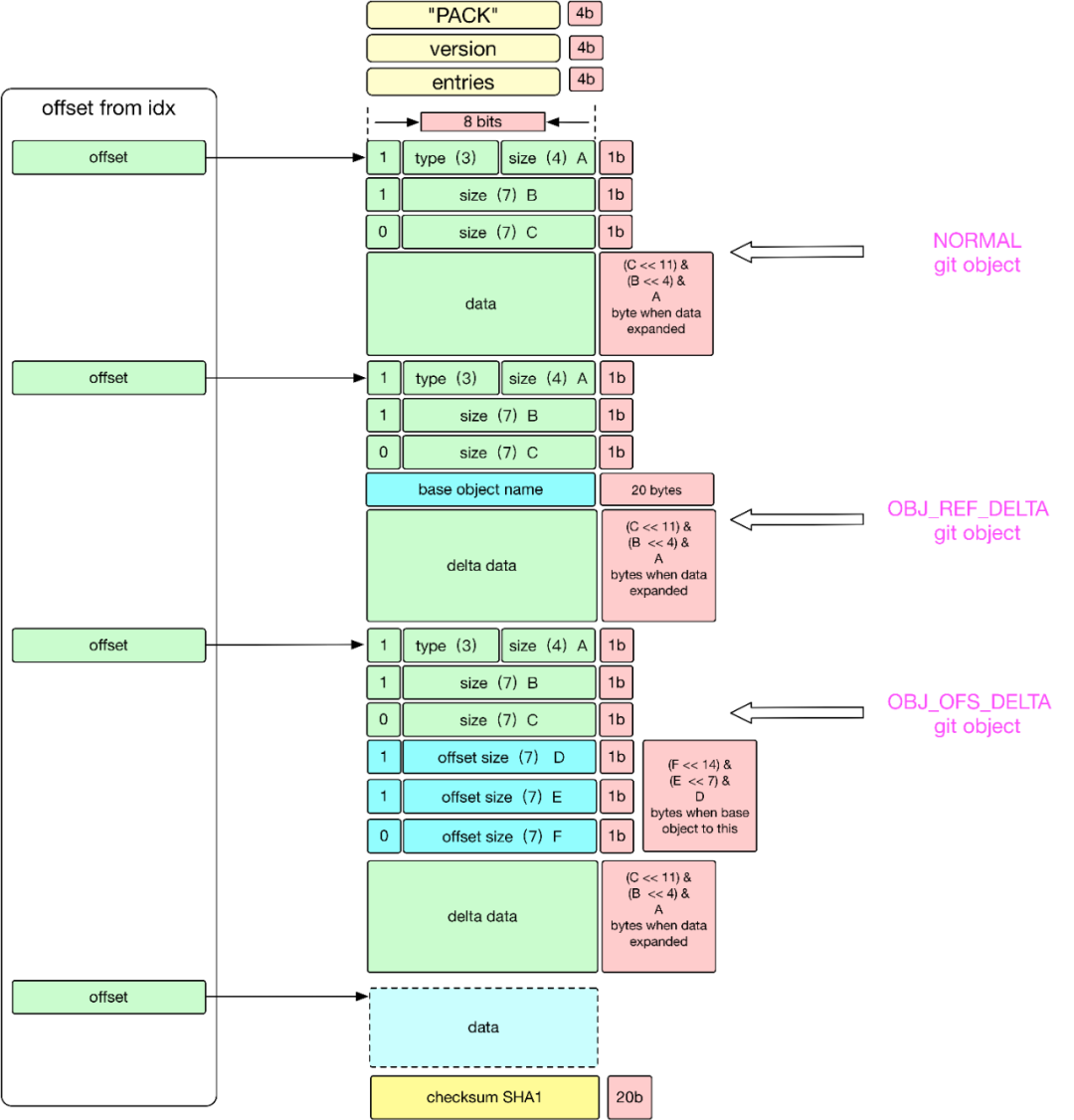 Body 部分主要是一个个 Git 对象依次存储,存储位置在 idx 索引文件中记录改对象在 pack 文件中的偏移量 offset。