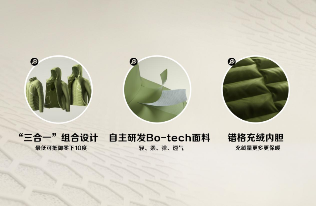 迎接户外风潮,波司登从消费者场景需求切入,对这次舒适户外羽绒服系列的外观进行了大幅焕面。例如在版型的拓展上,波司登舒适户外系列产品采用三合一组合设计,通过精研百万亚洲人体型,分别将15种版型差异化地运用在三合一的外套与内胆中,以迎合当下审美语境的舒适裁剪,演绎多种穿搭法则。在颜色择选上,亦摒弃硬核户外羽绒服跳跃的亮色,将低饱和的米、灰、绿等颜色纳入色盘,兼容户外场合的同时也适合通勤等都市场合穿着。
