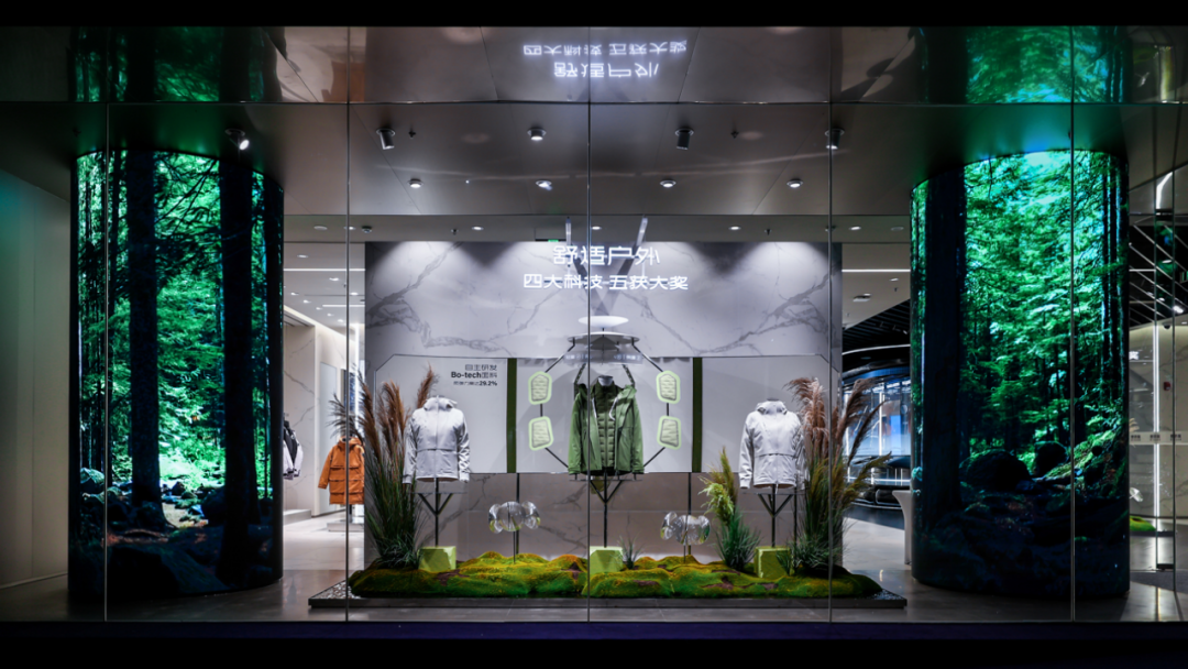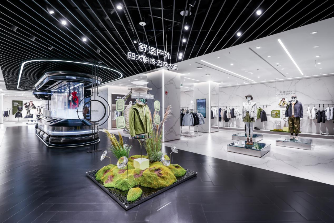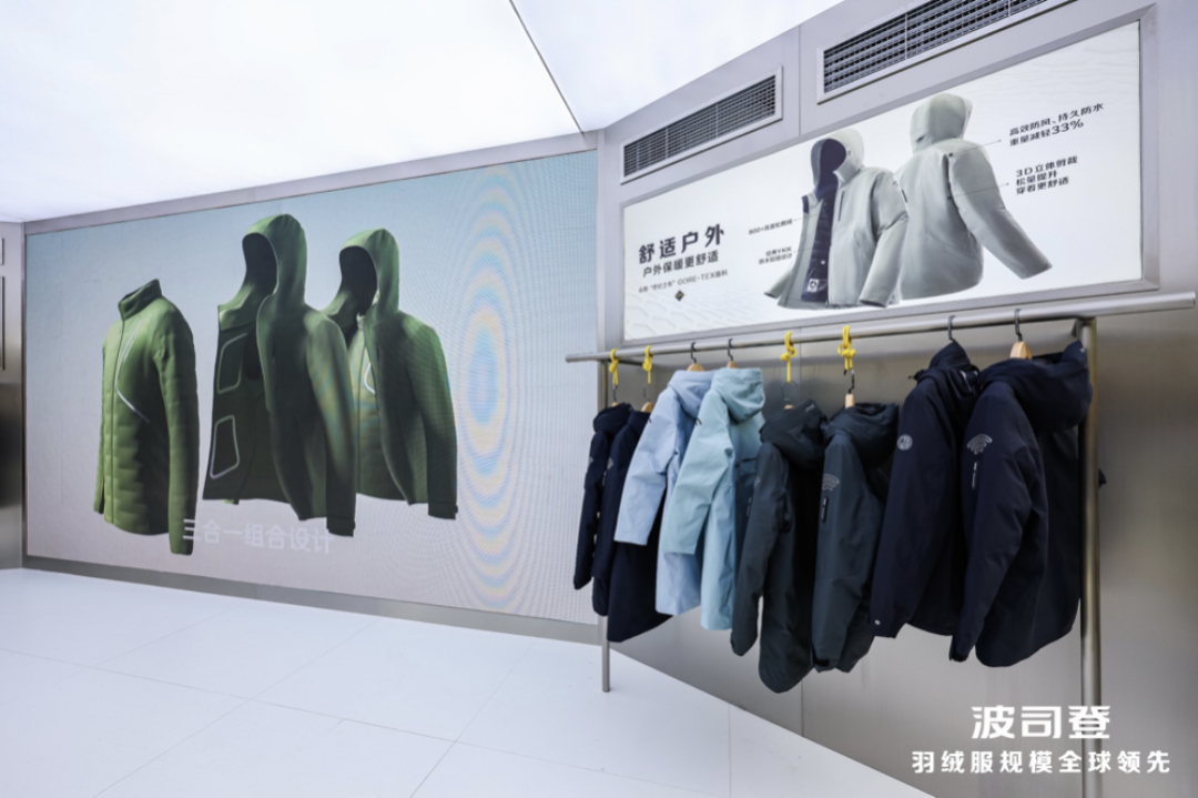 回看中国市场,波司登最近也在上海落下首家全球体验店。这座占地2000多平,高达三层的零售空间被划分为羽绒科技体验中心、场景体验中心和会员体验中心。除了超大型「365羽绒硬核科技装置」吸引消费者打卡,这家全球体验店还展示了波司登在国内外大秀现场的高定服装,用设计师专区还原了波司登设计师在设计「首创波司登风衣羽绒服」的工作场景,全面加深时尚与科技的完美融合。