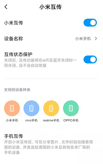 在更新到 MIUI 11 后,小米手机就可以向支持协议的机型互传了。