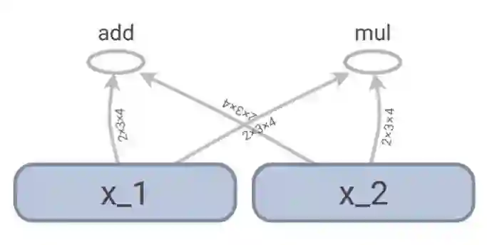 上面一段代码定义了两个计算,即随机生成 x_1、x_2(服从正态分布)之后分别做加法和乘法,在 TensorFlow 中,这就定义了一个计算图,这个计算图可表示如下: