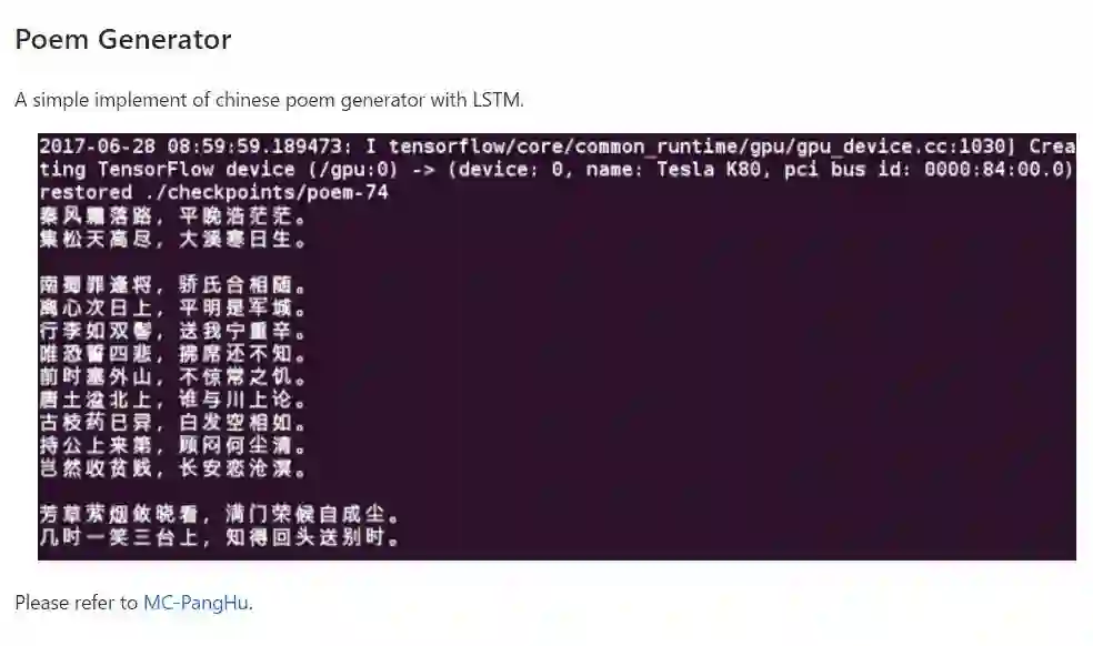 当然,还有很多的模型实现代码,不过这一部分并不是很全,还需要大家共同努力以完善这些代码与整个项目。这一部分模型的代码很多都是引用自十分流行的 GitHub 项目,例如 LSTM 章节中就引用了 Jipeng Huang 完成的 LSTM 唐诗生成器。