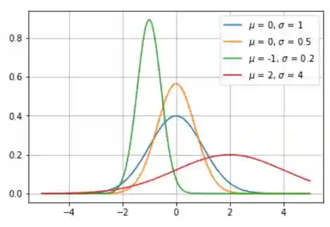 上图展示了高斯分布(正态分布)在不同均值μ和标准差σ下的概率密度函数,这样我们可以对高斯分布及参数的影响有一个直观的概念。