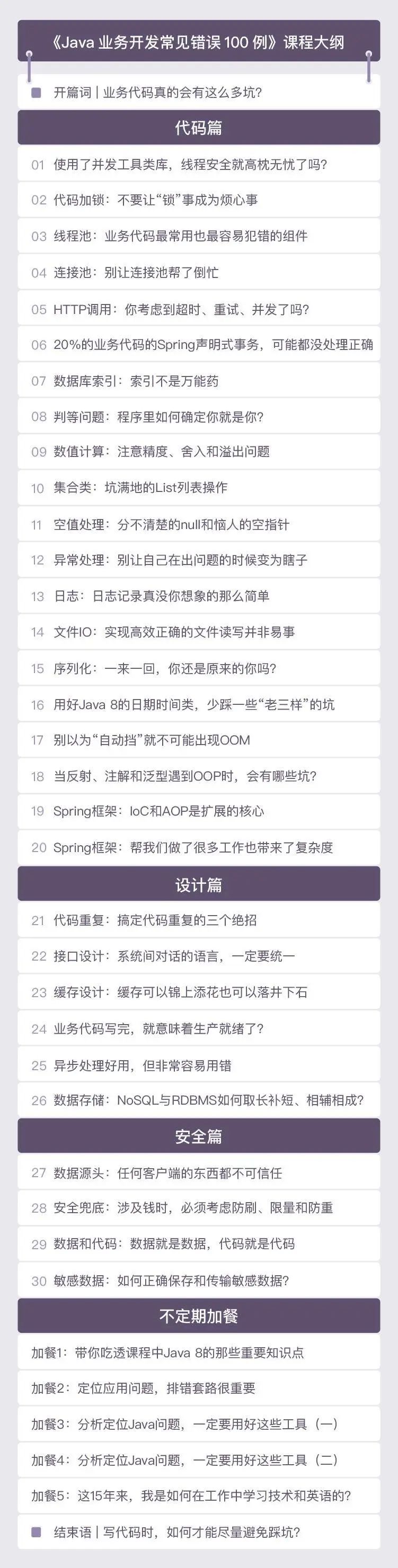 所以,我和极客时间合作了《Java 业务开发常见错误 100 例》专栏。