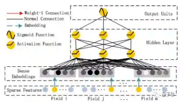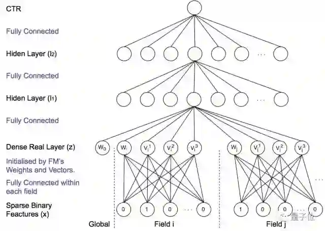 网络底层由FM来进行参数初始化,W的元素由FM中的低维连续空间向量表示来做初始化: