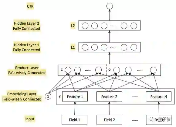 PNN主要是在深度学习网络中增加了一个inner/outer product layer,用来建模特征之前的关系,如下图,Product layer部分Z是weight*feature,P部分weight*I(feature_i,feature_j)用来建模二项式关系: