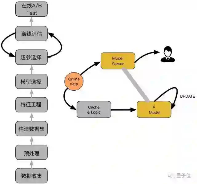 如上图,主要包括两大部分:离线部分、在线部分,其中离线部分目标主要是训练出可用模型,而在线部分则考虑模型上线后,性能可能随时间而出现下降,弱出现这种情况,可选择使用Online-Learning来在线更新模型: