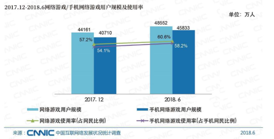 在《报告》中,网络游戏是被重点提及的一部分。截至2018年6月,我国手机网络游戏用户达到4.58亿,较去年末增长5123万人,占手机网民的58.2%。