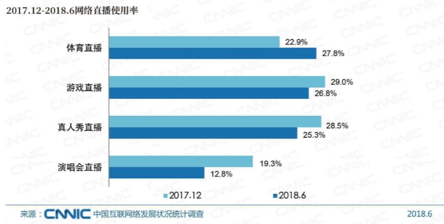 而网络直播的数据,可能是《报告》中最令人惊讶的了,截至2018年6月,网络直播用户规模达到4.25亿,较去年年末仅微增294万,用户使用率为53%,较2017年末下降1.7个百分点,游戏、真人秀、演唱会用户使用率均呈下降趋势。这也成了一片飘红的《报告》中为数不多的一点绿。