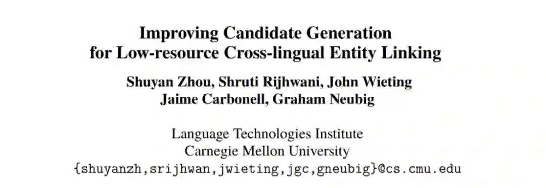 跨语言实体链接(Cross-lingual entity linking, XEL)的任务是在目标语言知识库(target-language知识库,KB)中查找从源语言文本中提取的提及内容。(X)EL的第一步是生成候选实体,它从目标语言知识库中为每个提到的候选实体检索貌似合理的候选实体列表。基于Wikipedia资源的方法已经在资源相对较多的语言(HRL)领域被证明是成功的,但是这些方法不能很好地扩展到资源较少的语言(LRL),即使有,也只有很少的Wikipedia页面。近年来,迁移学习方法已被证明可以利用相近语言的资源来降低语言学习对资源的需求,但其性能仍远远落后于资源丰富的语言学习。在本文中,我们首先评估了当前低资源XEL的实体候选生成方法所面临的问题,然后提出了三个改进:(1)减少实体提及和知识库条目之间的脱节,(2)提高模型对低资源场景的鲁棒性。这些方法很简单,但是很有效:我们在7个XEL数据集上对我们的方法进行了实验,发现与最先进的基线相比,它们在前30名标准候选召回中平均产生16.9%的收益。我们改进的模型还使端到端XEL的in-KB精度平均提高了7.9%。
