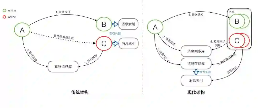 传统架构下,消息是先同步后存储。对于在线的用户,消息会直接实时同步到在线的接收方,消息同步成功后,并不会在服务端持久化。而对于离线的用户或者消息无法实时同步成功时,消息会持久化到离线库,当接收方重新连接后,会从离线库拉取所有未读消息。当离线库中的消息成功同步到接收方后,消息会从离线库中删除。传统的消息系统,服务端的主要工作是维护发送方和接收方的连接状态,并提供在线消息同步和离线消息缓存的能力,保证消息一定能够从发送方传递到接收方。服务端不会对消息进行持久化,所以也无法支持消息漫游。消息的持久化存储及索引同样只能在接收端本地实现,数据可靠性极低。